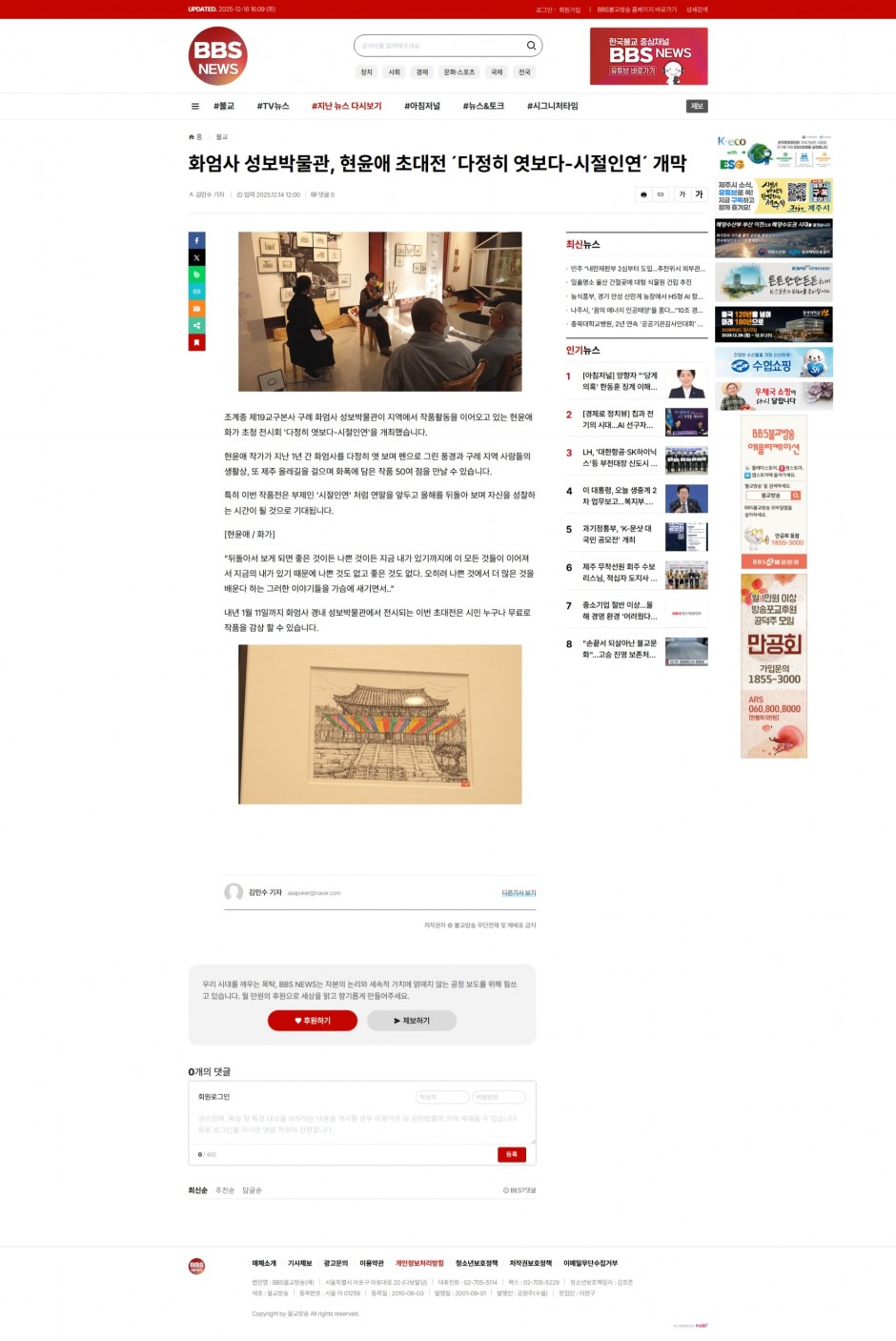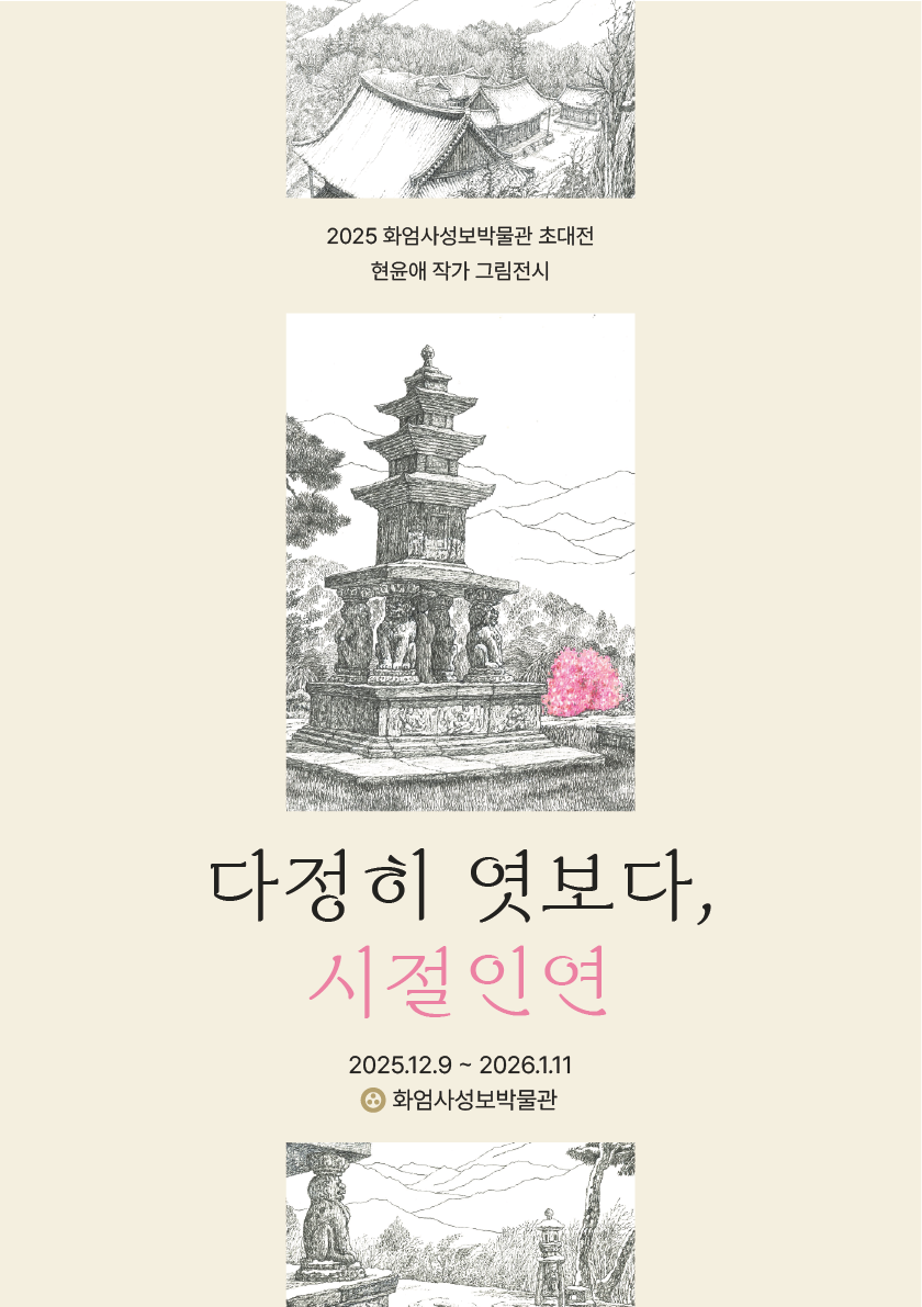 2025화엄사성보박물관 12월 초대전시 - 현윤애 작가 페이지 정보 작성자 가람지기 쪽지보내기 메일보내기 자기소개 아이디로 검색 전체게시물 쪽지보내기 메일보내기 자기소개 아이디로 검색 전체게시물 작성일25-12-16 16:25 조회67회 댓글0건 본문 https://news.bbsi.co.kr/news/articleView.html?idxno=4058211 많은 관람바랍니다.화엄사성보박물관 061-783-7610 다음글 목록 댓글목록 등록된 댓글이 없습니다.